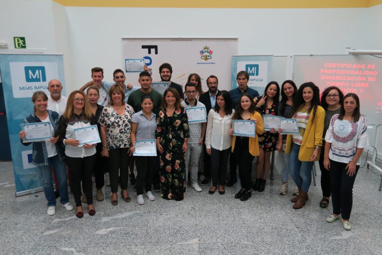 Mijas, 31 de octubre de 2019.- Un total de 15 personas han finalizado su paso por la primera edición del curso de Dinamizador de actividades de tiempo libre educativo infantil y juvenil, del Programa Operativo de Empleo Formación y Educación (POEFE), del proyecto Mijas Impulsa. “Los alumnos han tenido la oportunidad durante el verano de realizar 160 horas de prácticas en empresas, como escuelas infantiles, hoteles, ludotecas, que les ha permitido dar a conocer su forma de trabajar”, destacó la edil de Fomento del Empleo, Laura Moreno, que puso en valor el certificado de profesionalidad de nivel 2 que han obtenido al completar su formación en este curso y que les habilita para trabajar en toda la Comunidad Europea.
