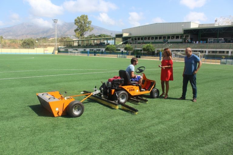 Mijas, 24 de agosto de 2017.- La edil de Deportes, Nuria Rodríguez (Cs), ha presentado una nueva máquina barredora-compactadora que se ha adquirido para un mejor mantenimiento del césped artificial de los cuatro campos de fútbol municipales. En principio, se cuenta con un único artilugio que el mismo departamento de mantenimiento desplazará por las cuatro superficies cada vez que necesite su uso. „El tratamiento que el césped artificial requiere no se podía realizar como es debido en los campos municipales, renovados todos en estos últimos tres años. El área no contaba con la maquinaria específica, y hemos llevado a cabo esta inversión para ofrecer a nuestros usuarios las mejores condiciones y que a su vez, el espacio tenga la mayor duración posible“, indica la concejala.