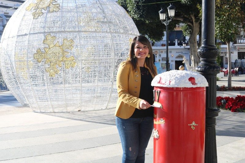 Mijas, 10 de diciembre de 2018.- El departamento de Fiestas del Ayuntamiento de Mijas ha instalado en los tres núcleos del municipio „buzones mágicos“ para que los jóvenes puedan echar sus cartas de navidad y sean recogidas por elfos para llevárselas a Papá Noel. La concejala del área, Tamara Vera (PSOE), ha visitado esta mañana el buzón situado en la Plaza Virgen de la Peña, junto al alumbrado navideño de Mijas Pueblo, y ha destacado la importancia de dinamizar la actividad de los vecinos mediante „novedades e iniciativas tan bonitas como esta“.