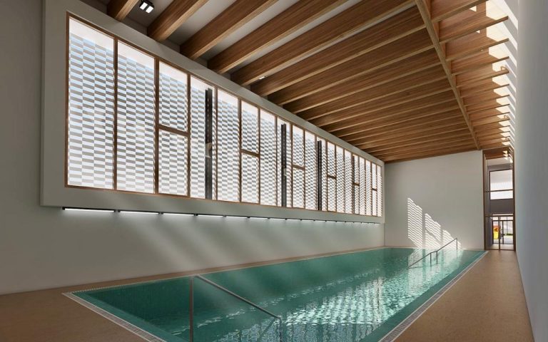 El acceso a la nueva piscina terapéutica tendrá conexión directa desde la plaza. Se dispondrán en la planta baja aseos y vestuarios accesibles. La cubierta de este edificio tendrá vigas que imitan a la madera, lo que facilitará el mantenimiento, y estará dispuesta en sentido transversal, con un gran ventanal longitudinal en la fachada sur que posibilitará la entrada de luz natural al recinto.