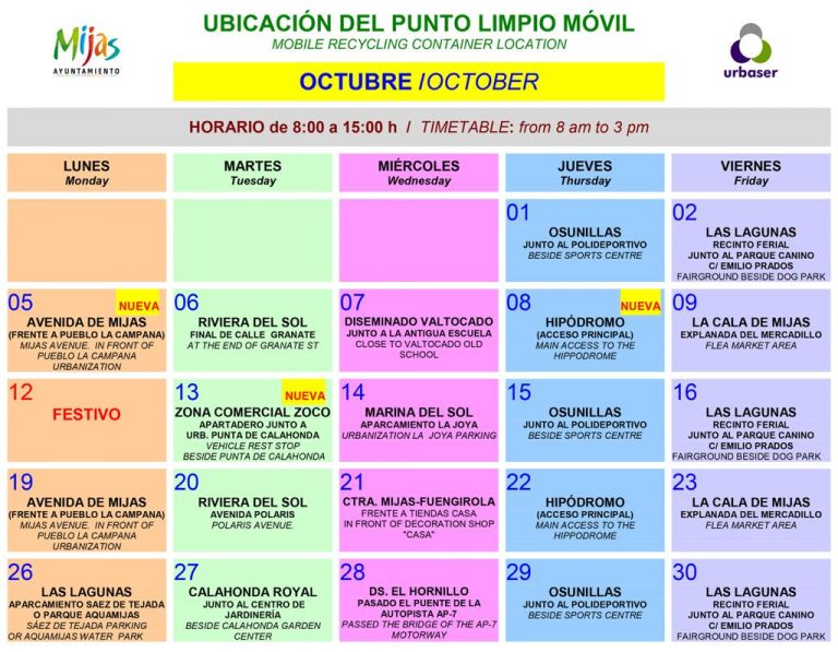 - Como cada mes, la Concejalía de Limpieza ha dado a conocer los diferentes enclaves de recogida de residuos para el mes de octubre.