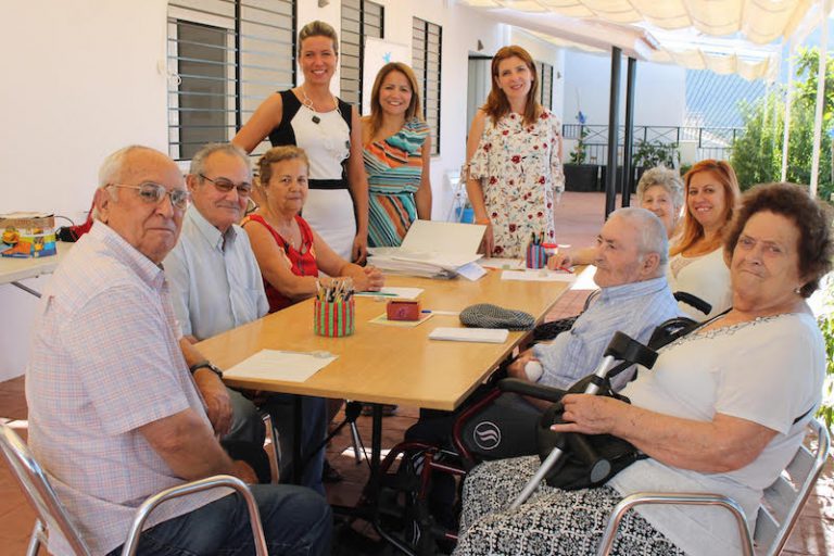 Mijas, 28 junio de 2017.-El centro de Alzheimer de Mijas Pueblo ya cuenta con toldos en la zona exterior de las instalaciones, tal y como han informado en su visita al centro las concejalas de Voluntariado, Laura Moreno (PSOE) y de Servicios Sociales, MariCarmen Carmona (C´s), junto a la directora de la oficina de Caixabank de Mijas Pueblo Jasmine Johansson.