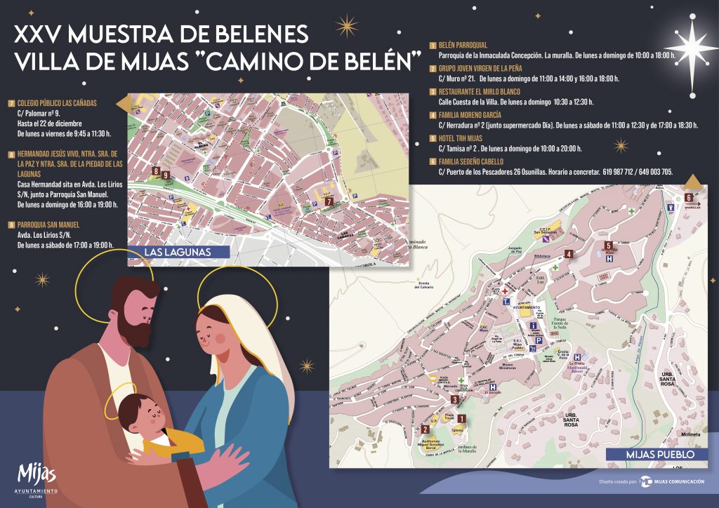 En esta edición se han inscrito nueve participantes en las diferentes categorías dispuestas: Asociaciones, peñas y hermandades; colegios y familiares. Pueden encontrar tres en el núcleo de Las Lagunas y seis en Mijas Pueblo. Además de éstos, en La Cala se puede visitar también el Belén de la parroquia de Santa Teresa.