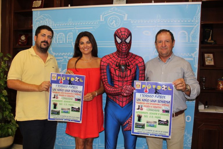 Mijas, 7 de junio de 2017.-La Mijas deportiva vuelve a demostrar su alma solidaria. La edil de Deportes, Nuria Rodríguez (Cs), ha presentado esta mañana junto al vicepresidente del Club Deportivo Mijas, Julio Garrido, un miembro de la directiva, Juan Francisco Aguilera, y el Spiderman solidario, el I Torneo de fútbol “Un niño, una sonrisa”, para colaborar en recaudar fondos para que estos personajes puedan seguir animando a los pequeños del Materno Infantil de Málaga en sus estancias en el hospital. El evento tendrá lugar el próximo viernes 9 de junio a partir de las 20″30 horas en el Campo de Fútbol Municipal Antonio Márquez. “Quiero agradecer tanto la labor de Spiderman con estos niños como la del CD Mijas por organizar un torneo tan importante en materia solidaria. Desde el Ayuntamiento siempre vamos a apoyar y colaborar con eventos de esta índole donde los más importantes son los pequeños”, apunta la concejala.