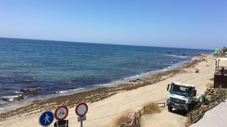 Mijas, 15 de julio de 2020.- El concejal de Playas del Ayuntamiento de Mijas, José Carlos Martín, ha informado esta semana de los trabajos de recogida de algas llevados a cabo entre los meses de junio y julio en el litoral mijeño “y que han supuesto la retirada hasta el momento de hasta 216 toneladas de una nueva especie invasora que ya apareció el año pasado en otros puntos del litoral malagueño y que este verano han llegado hasta nuestro municipio”, señala el edil.