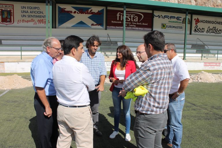 Mijas, 6 de octubre de 2016.- El edil de Infraestructuras del Ayuntamiento de Mijas, José Carlos Martín (Cs) y la concejala de Deportes, Nuria Rodríguez (Cs), han visitado esta mañana el campo de fútbol de Osunillas donde se están ejecutando las labores de mejora del recinto así como la renovación del césped artificial. « Los trabajos estarán finalizados a principios de diciembre. Queremos reducir los plazos de ejecución y se lo hemos planteado a la empresa que se encarga de la obra. Se han mostrado receptivos y van a intentar alcanzar este propósito », señala Martín. La inversión municipal asciende a 206.672 euros lo que supone un ahorro de más de 90.000 euros respecto al precio de licitación. « Se trata de un compromiso del Ayuntamiento con el CD Mijas. Queremos equipararlos al resto de campos de fútbol del municipio y que de esta manera puedan disfrutar los usuarios de unas buenas instalaciones », apunta Rodríguez.
