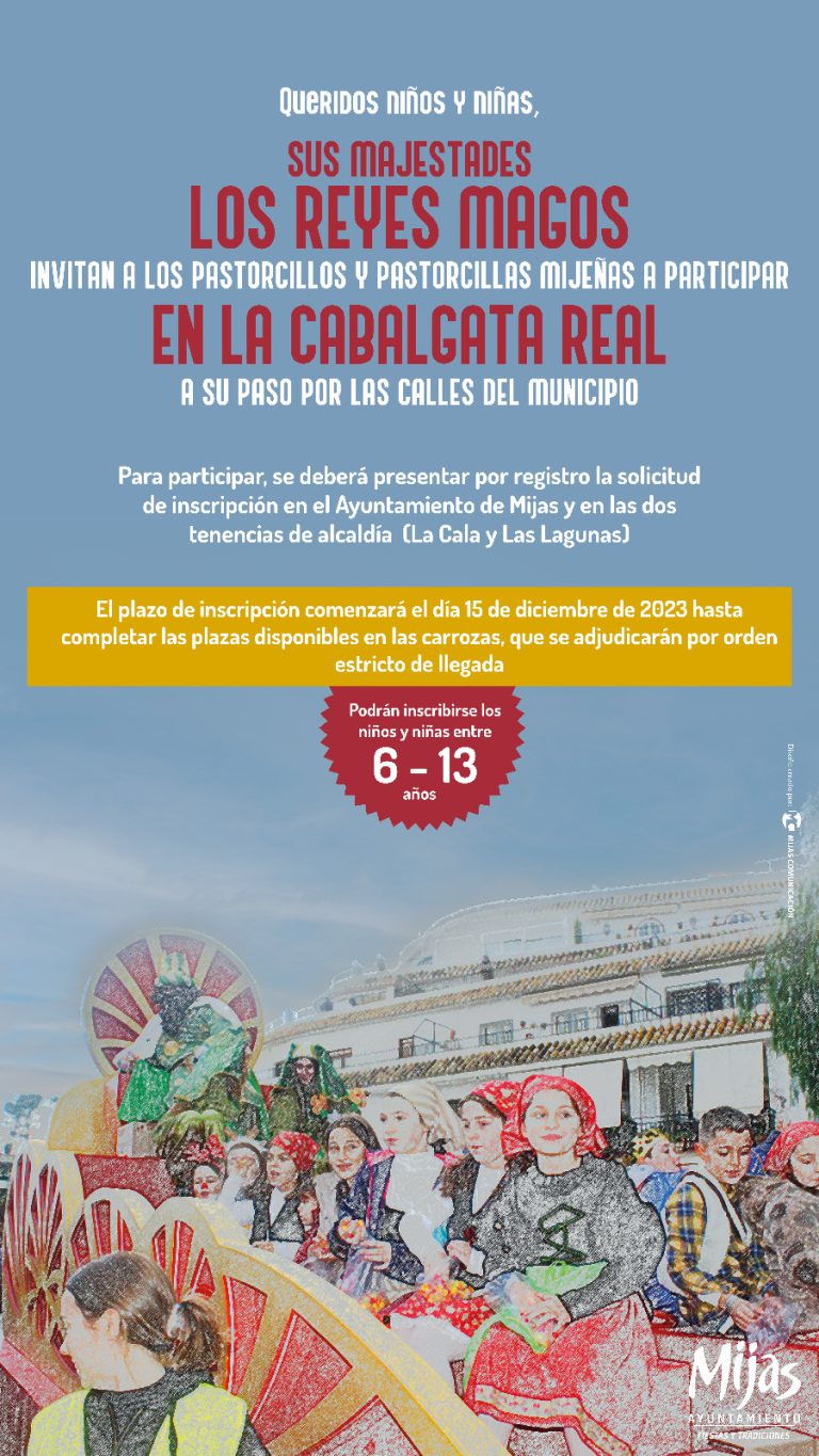 La concejalía de Fiestas y Tradiciones informa que los niños y niñas que quieran participar en las carrozas de las cabalgatas de los Reyes Magos, que recorrerán las calles de los tres núcleos mijeños, podrán solicitarlo desde el próximo viernes 15 de diciembre. Para ello, se deberá presentar por registro la solicitud de inscripción en el Ayuntamiento de Mijas y en las dos tenencias de alcaldía (La Cala y Las Lagunas).