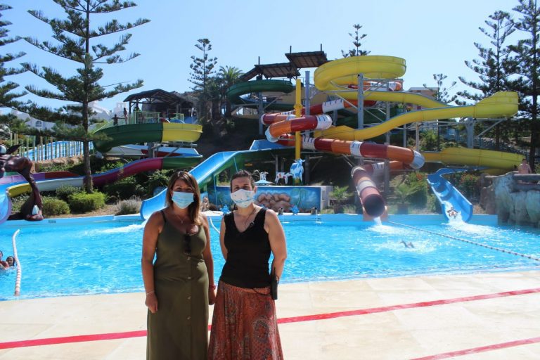 Mijas, 28 de julio de 2020.- La concejala de Juventud del Ayuntamiento de Mijas, Tamara Vera, junto a la directora del parque acuático AquaMijas, María del Mar Asesio, presentaban esta mañana la nueva iniciativa puesta en marcha gracias a la colaboración entre Ayuntamiento y empresa por la cual cada semana de agosto los usuarios podrán conseguir entradas gratuitas para disfrutar de estas instalaciones.