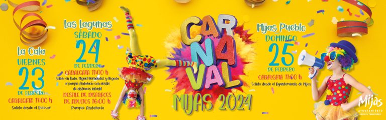 Mijas, 23 de febrero de 2024.- Mijas ya celebra su fin de semana más carnavalero. Y es que esta tarde arranca la edición del carnaval, en la que está previsto que haya desfiles, concursos, actuaciones y actividades para todas las edades. Desde el Ayuntamiento de Mijas se ha preparado un completo programa que tendrá como escenario los tres núcleos de población, empezando hoy mismo por La Cala, para pasar este sábado a Las Lagunas y el domingo a Mijas Pueblo.