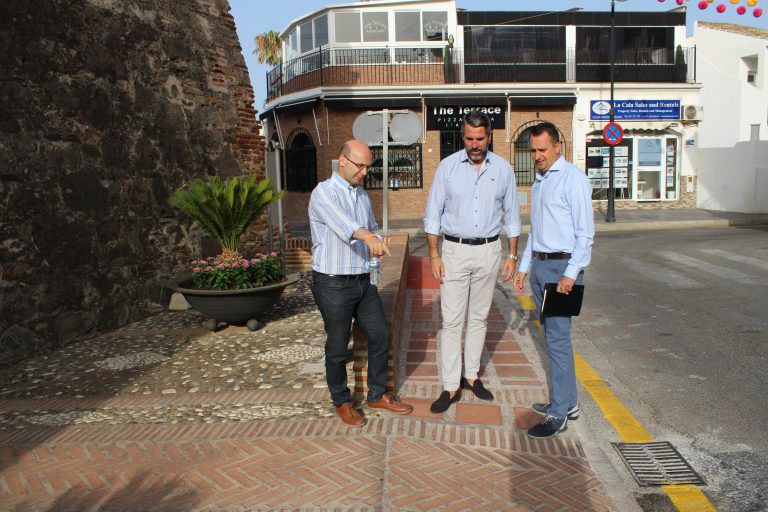 Mijas, 23 de julio de 2018.- El alcalde de Mijas, Juan Carlos Maldonado (Cs) y el edil de Servicios Operativos, José Carlos Martín (Cs), han visitado esta mañana el entorno de El Torreón de La Cala donde dicho departamento municipal ha renovado la solería de este monumento caleño. « Hemos eliminado los problemas de accesibilidad, especialmente, para los mayores y las personas con movilidad reducida. Este enclave contaba con un suelo de piedras de gran tamaño ya erosionadas con el tiempo lo que lo hacía aún más resbaladizo y no contaba con una rampa adecuada para sillas de ruedas o carritos de bebés. Ahora todo este problema se ha erradicado », apunta Maldonado.