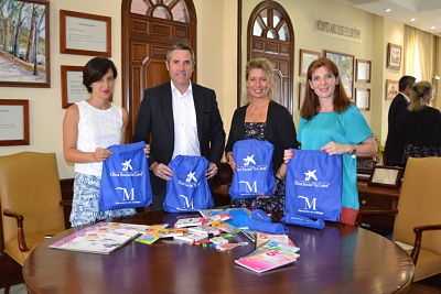 Mijas, 21 de septiembre de 2016.-La Obra Social ‘La Caixa’ ha entregado este viernes al municipio de Mijas un total de 290 bolsas de material escolar, dentro del programa « Tu material estrella » en colaboración con la Diputación de Málaga. El objetivo principal de esta actuación trata de facilitar las herramientas necesarias para los alumnos de la provincia malagueña que no tienen los recursos suficientes para obtenerlos y de esta forma no se vean perjuficados en su desarrollo académoico. « Estamos hablando de niños que deben tener las mismas posibilidades que el resto para así tener una sociedad lo más justa posible y más igualitaria, y de esta forma podamos construir una Mijas mejor » apunta el alcade de la ciudad, Juan Carlos Maldonado, que junto a la concejala de Asuntos Sociales, Mari Carmen Carmona, y a la diputada del mismo área, Lourdes Burgos, recibía en el despacho de alcaldía a la directora de la oficina en Mijas de La Caixa, Jasmin Johansson.
