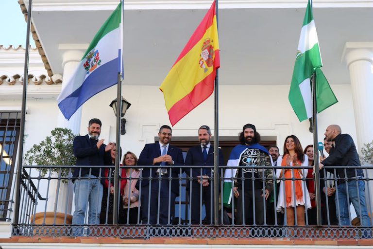 Mijas, 23 de febrero de 2018.-La corporación municipal y los vecinos de Mijas han esperado esta mañana a las puertas del Ayuntamiento la llegada del medallista olímpico, Regino Hernández. El deportista vuelve a su pueblo tras ganar el bronce de snowboard cross en los Juegos Olímpicos de Invierno 2018 celebrados en PyeongChang. El alcalde del municipio, Juan Carlos Maldonado (Cs) le ha recibido junto al resto de miembros del equipo de gobierno en la alcaldía donde ha firmado en el libro de honor. Tras regalarle la bandera mijeña, Hernández se ha asomado al balcón del Consistorio para saludar a sus vecinos. « Desde la visita de la Reina Doña Sofía no se producía la apertura oficial del balcón del Ayuntamiento para saludar. Eso significa la importancia que para nosotros adquiere este momento. Mijas ha hecho historia y la ha hecho gracias a un joven de Las Lagunas que desde pequeñito estuvo montado en una tabla de Snowboard y que unos años después revolucionaba a todo Mijas dejando el nombre de nuestro pueblo en lo más alto del deporte español », señala Maldonado.