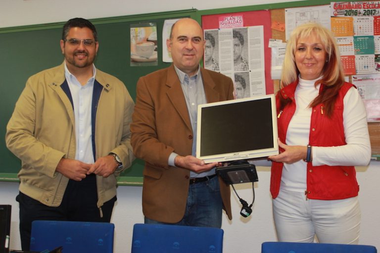 Mijas, 14 noviembre 2016.- El concejal de Nuevas Teconologías, José Antonio González (PSOE), junto al de Educación, Hipólito Zapico (PSOE), han hecho entrega de equipamiento informático al CEIP El Albero, uno de los centros que recibirán pantallas de forma gratuita tras la colaboración de ambos departamentos.