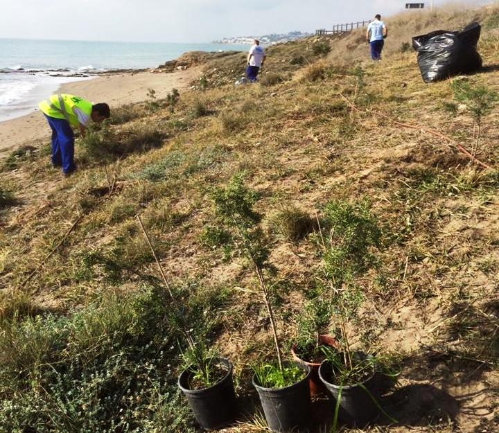 4 de enero de 2016.- El grupo de Playas de la Renta Básica continúa con su plan de repoblación de especies vegetales marinas en las playas de Mijas. En esta ocasión, han actuado en la playa nudista o Playamarina donde han plantado 156 enebros marinos para recuperar la flora autóctona de la zona.